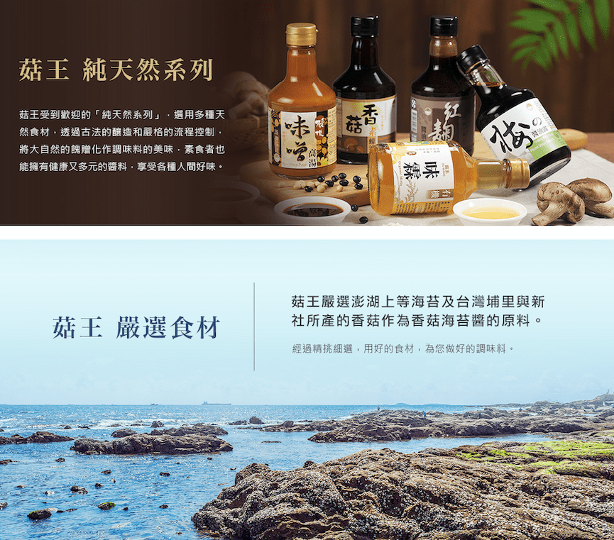 嚴選澎湖上等海苔、中國紫菜和韓國昆布,三樣缺一不可,再搭配埔里、新社兩地所產的香菇,加入高級醬油一起熬煮,去除不討喜的腥味,是記憶中的兒時滋味、山與海交織的美味!